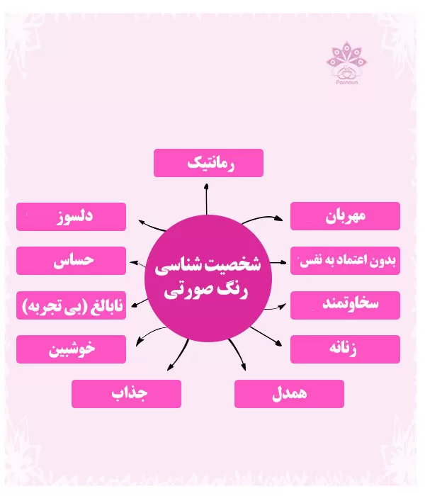 رنگ صورتی نشاندهنده عشق بیقیدوشرط، زنانگی، ناپختگی و کمی بازیگوشی است. این رنگ القاکننده نوعی حس آرامش بدون تهدید است و گاهی با بیگناهی، خوشبینی و امید همراه میشود. رنگ صورتی در اغلب موارد ابعاد مثبت زنانگی مانند مهربانی و پرورش را نشان میدهد، اما گاهی حساسیت و آسیبپذیری را منتقل میکند.